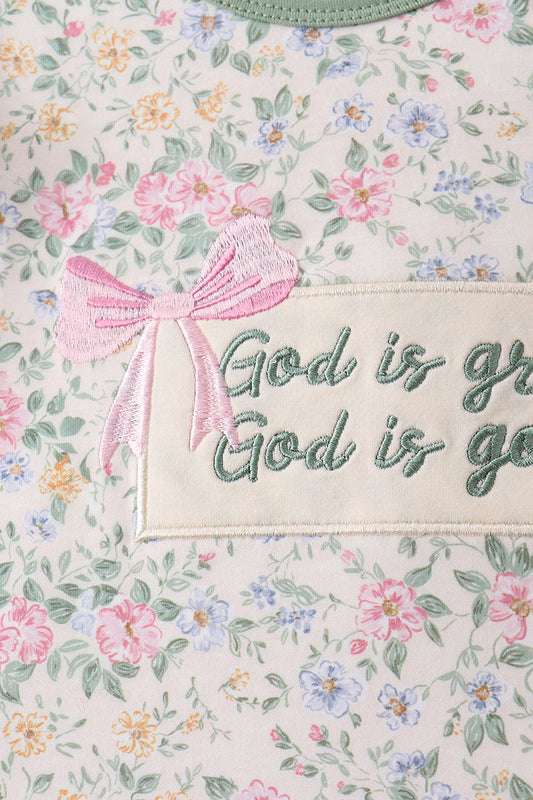 Green floral print bow ruffle dress