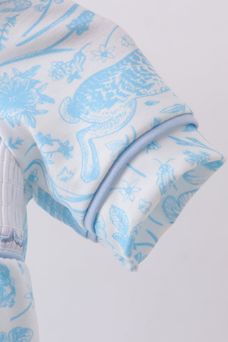 Hop into adorable style with this charming blue bunny bubble! Featuring a smocked Peter Pan collar and whimsical bunny design, this playful piece brings storybook charm to any little one's wardrobe. The soft bubble silhouette offers comfortable movement for active play, while the classic Peter Pan collar adds a touch of timeless elegance. Perfect for special occasions or everyday adventures, this sweet bunny bubble is sure to make your child smile.
